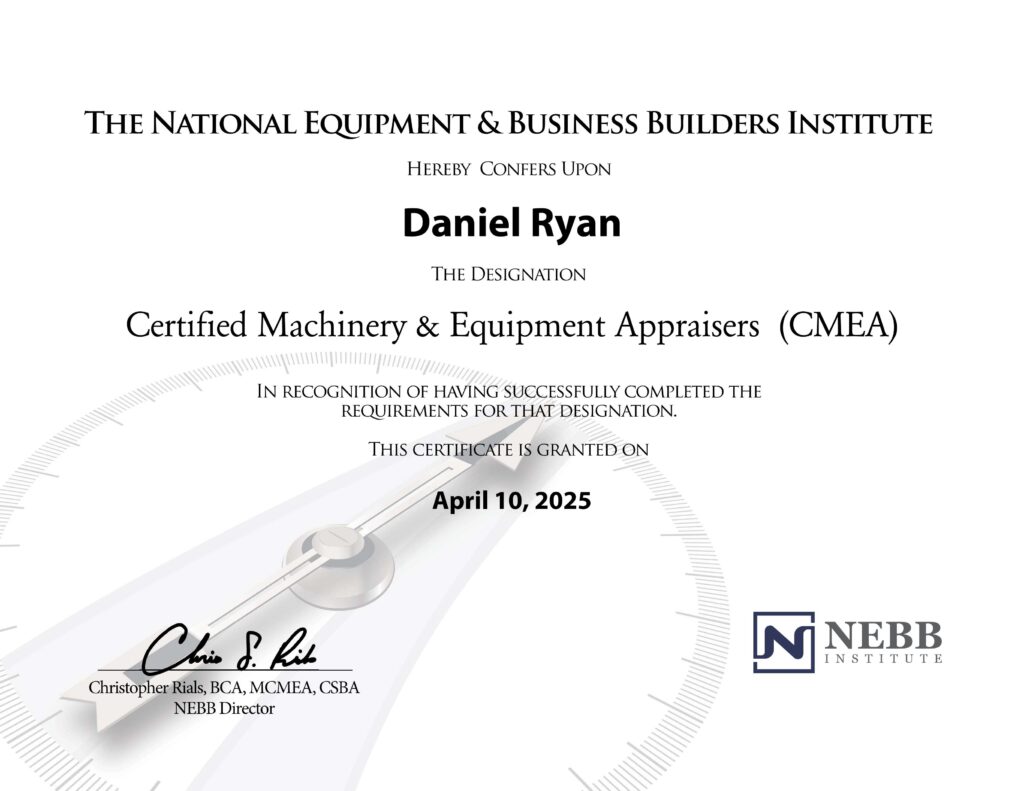 I am Dan Ryan, a certified machinery and equipment appraiser through the NEBB Institute and the founder of DES Asset Appraisal. I specialize in providing clear, accurate, and defensible valuations for construction, industrial, and heavy equipment. My goal is to deliver honest, reliable appraisal reports that help clients make confident financial, operational, and strategic decisions. With hands-on industry experience in Construction, and Heavy Equipment Fields, also a commitment to integrity, I take pride in offering practical insights backed by professional certification and real-world knowledge..